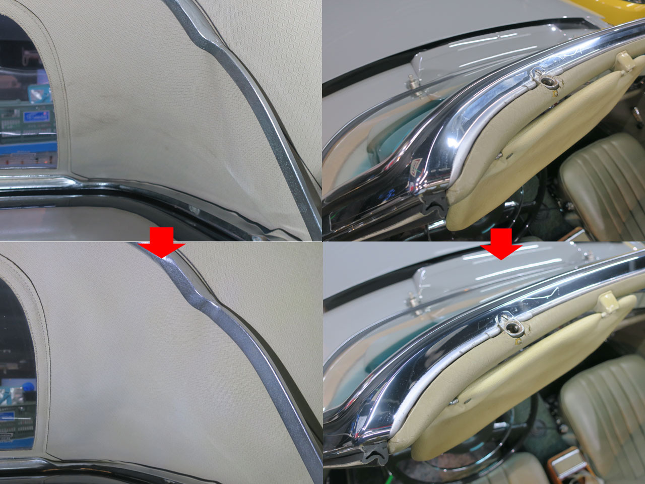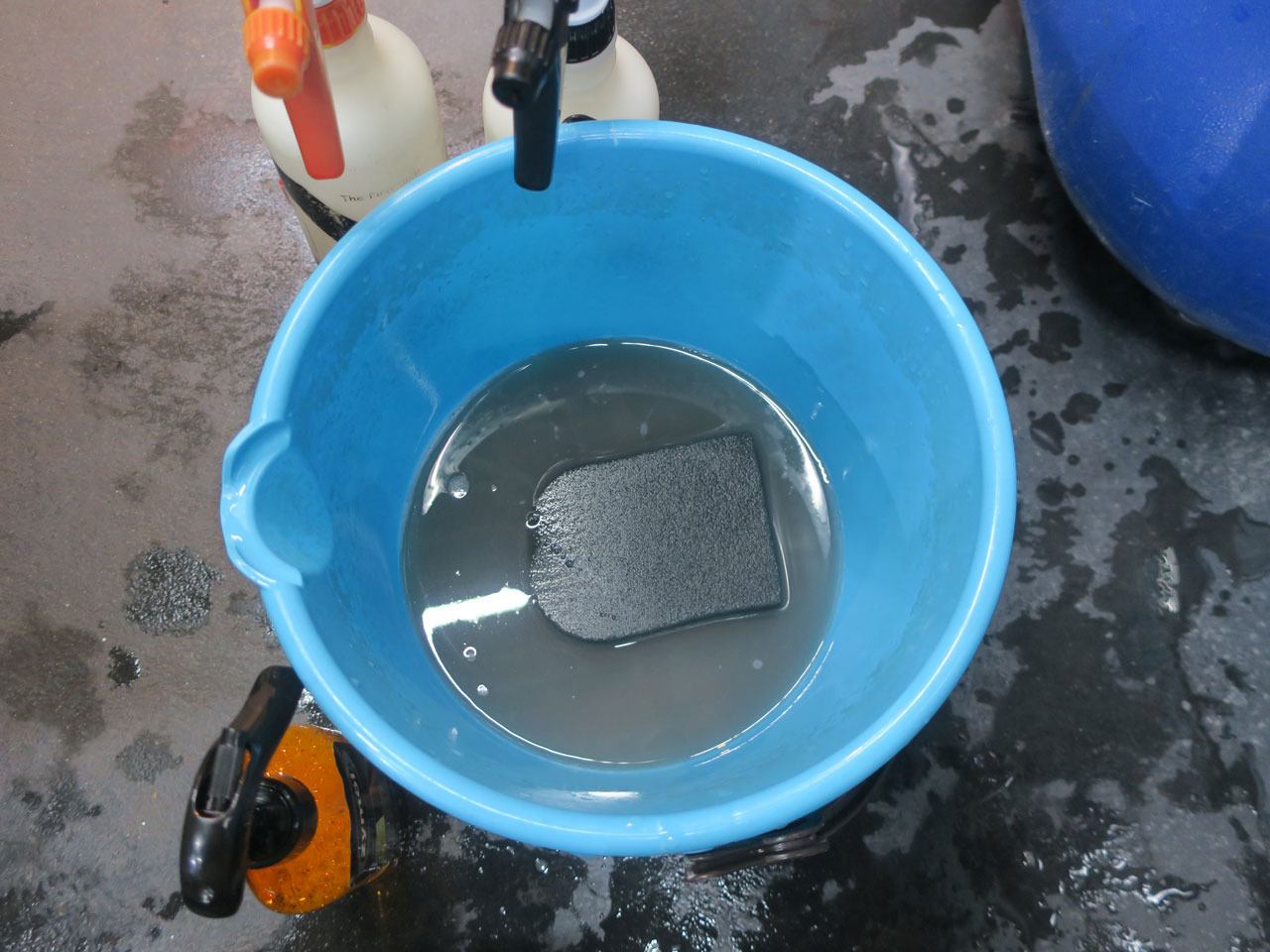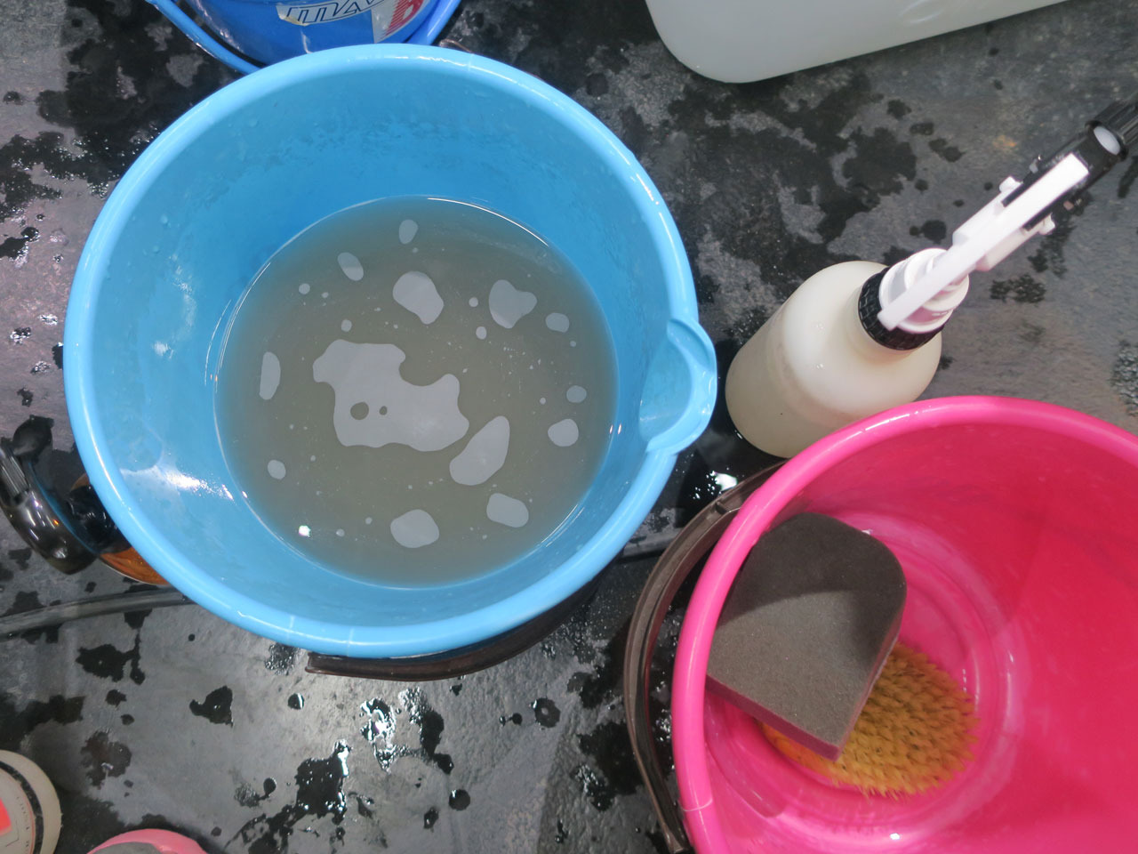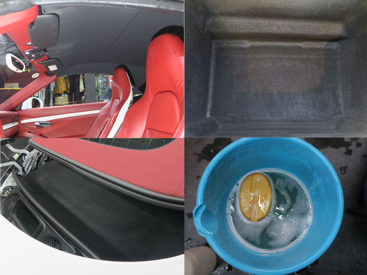 ルーフライニングやフロントラゲッジ内、幌格納部も洗浄(バケツの汚れはその洗浄排水)